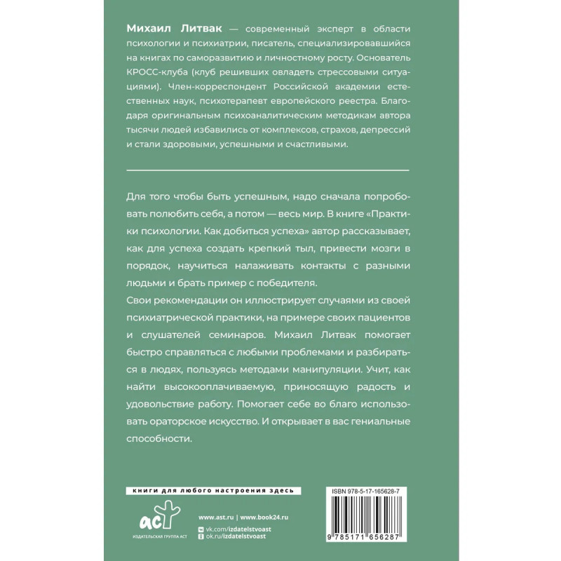 Михаил Литвак ведущий психотерапевт международного реестра, автор книг, изданных тиражом 15 000 000 экземпляров. Он вывел правила психологии и логики, которые помогают быстро справляться со всеми проблемами, пользуясь особыми методами манипуляции. Для того чтобы быть успешным, надо сначала попробовать полюбить себя, а потом весь мир. В книге "Практики психологии. Как добиться успеха" автор рассказывает, как для успеха создать крепкий тыл, привести мозги в порядок, научиться налаживать контакты с разными людьми и брать пример с победителя. Свои рекомендации он иллюстрирует случаями из своей психиатрической практики, на примере своих пациентов и слушателей семинаров. Михаил Литвак помогает быстро справляться с любыми проблемами и разбираться в людях, пользуясь методами манипуляции. Учит, как найти высокооплачиваемую, приносящую радость и удовольствие работу. Помогает себе во благо использовать ораторское искусство. И открывает в вас гениальные способности.
