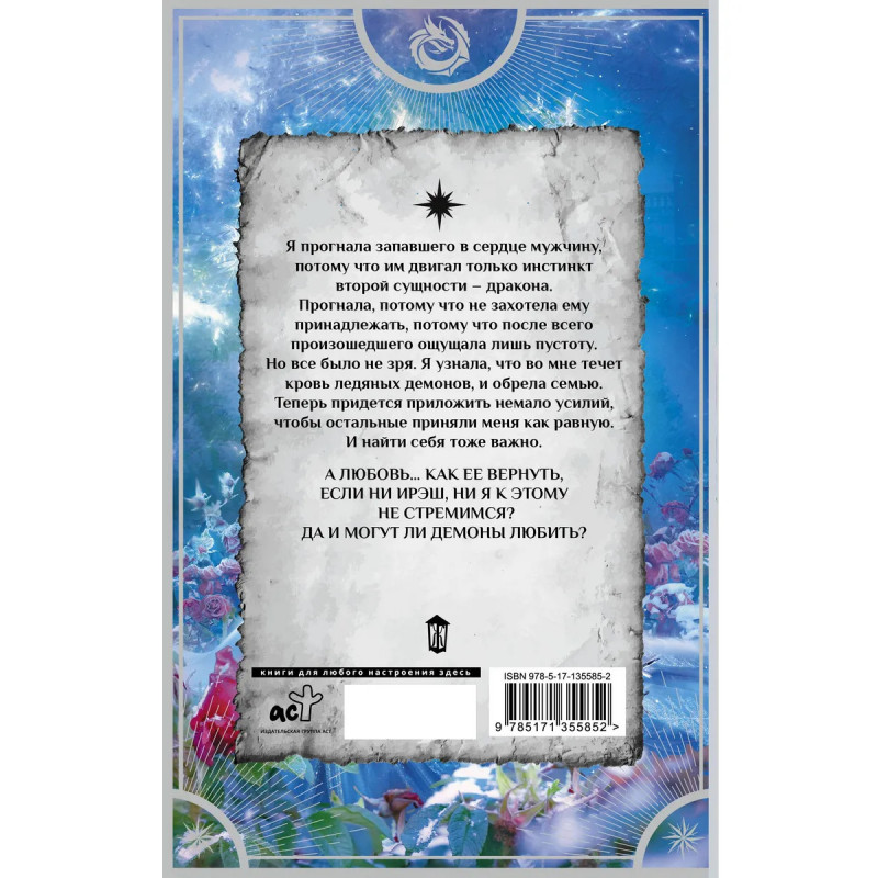 Новинка в серии «Любовь внеземная». Заключительная часть трилогии популярной писательницы в жанре романтического фэнтези Марии Боталовой. История Лайлы и Ирэша заканчивается, но жизнь, любовь и приключения героев продолжаются. Лайла прогнала любимого мужчину, зато обрела семью. Полностью осознав себя частью расы ледяных демонов, она получила своего рода и дар, и проклятие. Теперь ей предстоит приложить немало усилий, чтобы и остальные приняли ее как равную. Впрочем, и любовь от Лайлы никуда не денется. И ей, и Ирэшу предстоит разобраться с внутренними проблемами и найти дорогу к друг другу. Харизматичные герои с понятными каждому чувствами и эмоциями и динамичный непредсказуемый сюжет держат в напряжении до самого финала, который все расставит по местам.