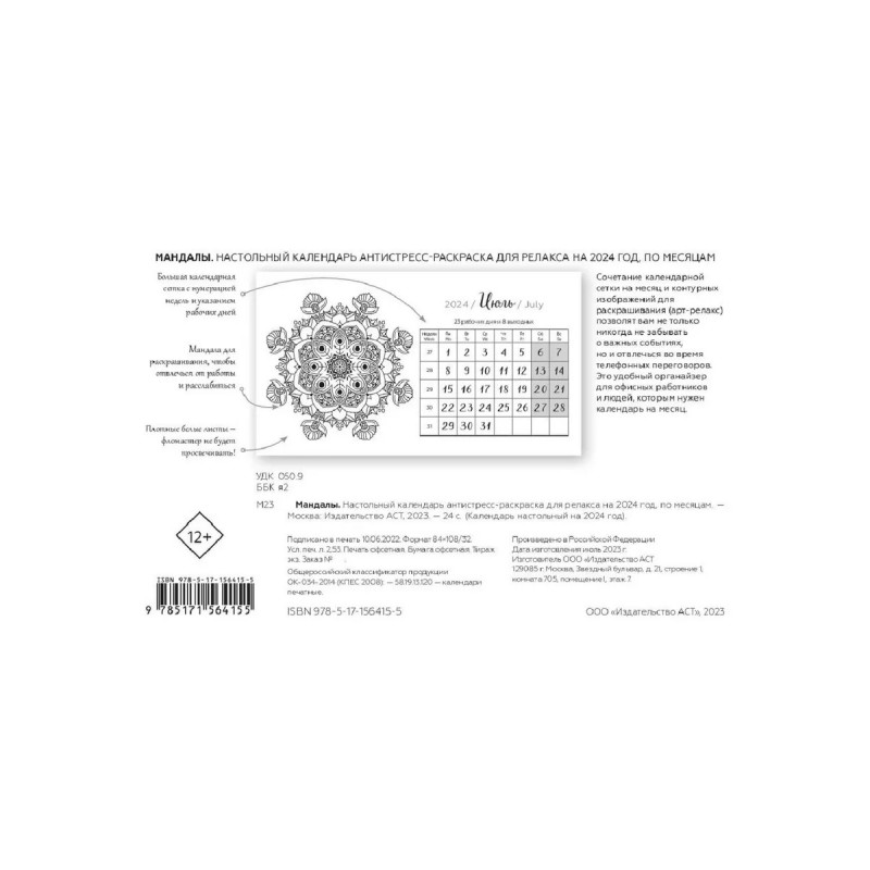Характеристики Мандалы. Настольный календарь антистресс-раскраска для релак