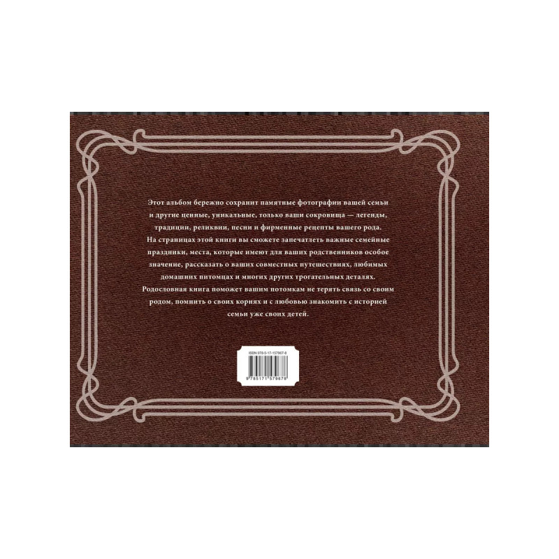 Этот альбом бережно сохранит памятные фотографии вашей семьи и другие ценные, уникальные, только ваши сокровища легенды, традиции, реликвии, песни и фирменные рецепты вашего рода. На страницах этой книги вы сможете запечатлеть важные семейные праздники, места, которые имеют для ваших родственников особое значение, рассказать о ваших совместных путешествиях, любимых домашних питомцах и многих других трогательных деталях. Родословная книга поможет вашим потомкам не терять связь со своим родом, помнить о своих корнях и с любовью знакомить с историей семьи уже своих детей.