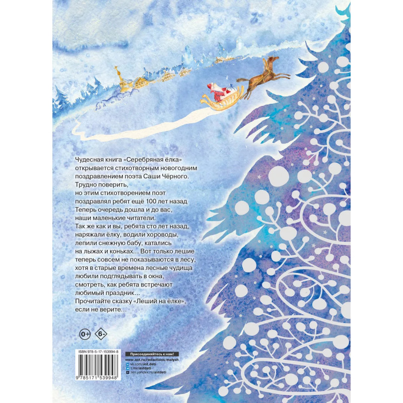 Серебряная ёлка. Чудесная книга "Серебряная ёлка" открывается стихотворным новогодним поздравлением поэта Саши Чёрного. Трудно поверить, но этим стихотворением поэт поздравлял ребят ещё 1 лет назад. Теперь очередь дошла и до вас, наши маленькие читатели. Так же как и вы, ребята 1 лет назад, наряжали ёлку, водили хороводы, лепили снежную бабу, катались на лыжах и коньках... Вот только лешие теперь совсем не показываются в лесу, хотя в старые времена лесные чудища любили подглядывать в окна, смотреть, как ребята встречают любимый праздник... Прочитайте сказку "Леший на ёлке", если не верите...