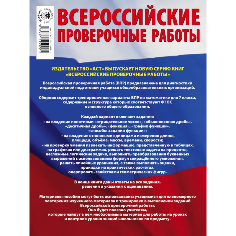 Данное пособие предназначено для учащихся 7-х классов общеобразовательных организаций. Оно позволяет в кратчайшие сроки проверить свои знания, потренироваться в выполнении заданий и тем самым успешно подготовиться к выполнению Всероссийской проверочной работы по математике по итогам обучения в 7-м классе. Пособие содержит 15 тренировочных вариантов проверочных работ. Содержание проверочной работы соответствует Федеральному государственному образовательному стандарту основного общего образования. Каждый вариант составлен в полном соответствии с демонстрационным вариантом, представленном на информационных порталах по Всероссийским проверочным работам. В конце книги даны ответы на все задания, решения и указания к оцениванию. Материалы пособия будут полезны учителям, которые найдут в нём материал для работы на уроках и контроля уровня знаний школьников по предмету.