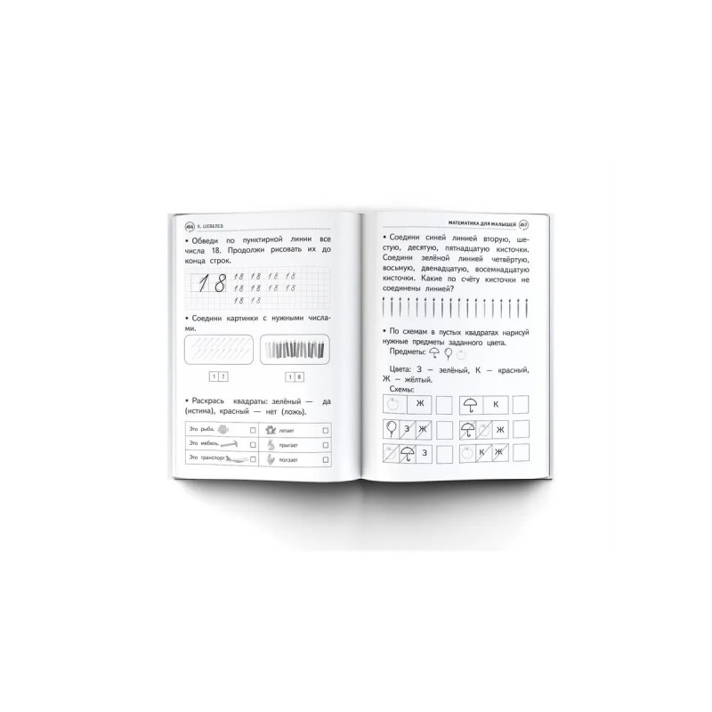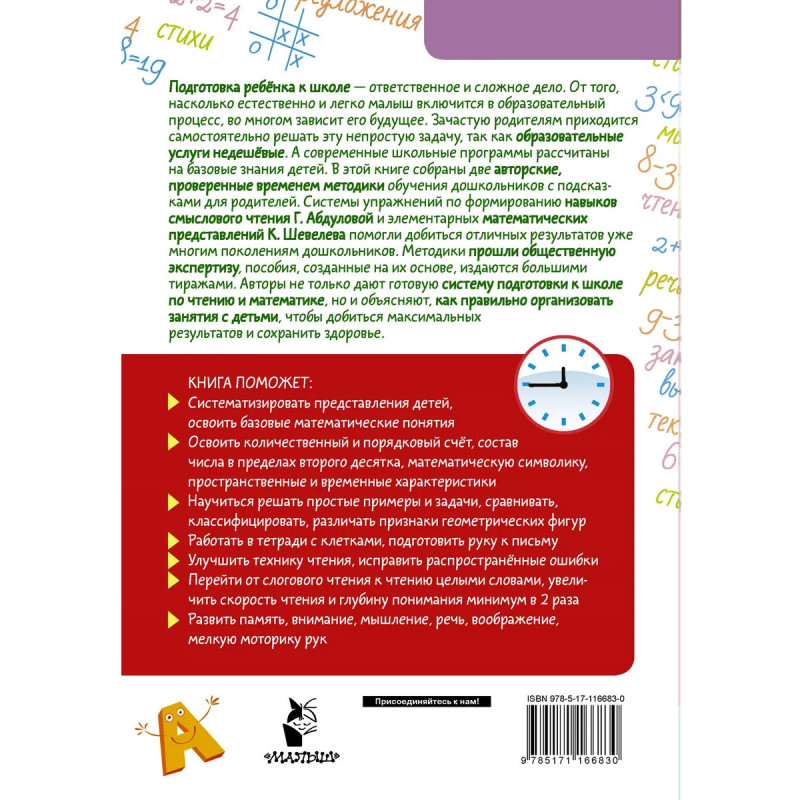 7 причин купить книгу. КНИГА ПОМОЖЕТ: - Систематизировать представления детей, освоить базовые математические понятия - Освоить количественный и порядковый счёт, состав числа в пределах второго десятка, математическую символику, пространственные и временные характеристики - Научиться решать простые примеры и задачи, сравнивать, классифицировать, различать признаки геометрических фигур - Работать в тетради с клетками, подготовить руку к письму - Улучшить технику чтения, исправить распространённые ошибки - Перейти от слогового чтения к чтению целыми словами, увеличить скорость чтения и глубину понимания минимум в 2 раза - Развить память, внимание, мышление, речь, воображение, мелкую моторику рук