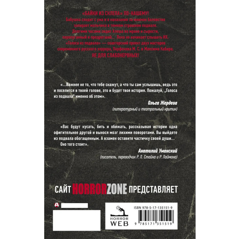 "Байки из склепа" по-нашему! У мальчика Алеши плохая наследственность его бабушка медленно сходит с ума, но об этом мало кто догадывается. Ничего не подозревающие родители отправляют Алешу в деревню на все лето. А бабушка в наказание за мнимое баловство запирает мальчика в темном страшном подвале. Долгими часами сидит Алеша во мраке и сырости, совсем один, перепуганный и продрогший... пока не начинает слышать "голоса". Они нашептывают ему истории, от которых кровь стынет в жилах. Рассказывают о жизни и смерти, любви и ненависти, предательстве и жестокой мести. Жуткие, но увлекательные рассказы затрагивают в душе что-то такое, что заставляет Алешу вновь и вновь спускаться в затхлую темень, чтобы услышать таинственные голоса