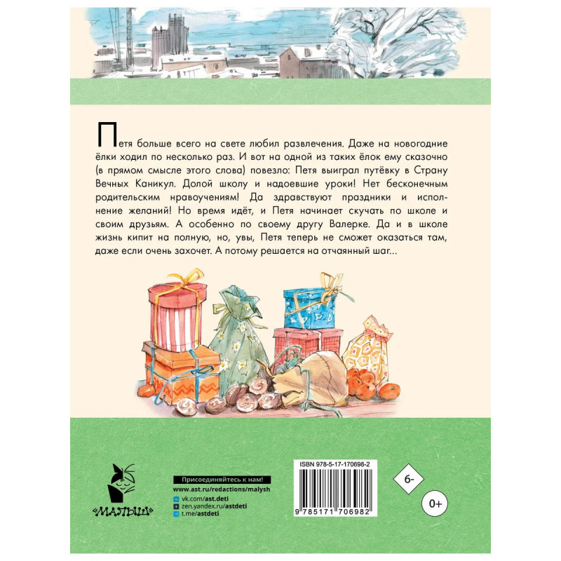 Петя больше всего на свете любил развлечения. Даже на новогодние ёлки ходил по несколько раз. И вот на одной из таких ёлок ему сказочно (в прямом смысле этого слова) повезло: Петя выиграл путёвку в Страну Вечных Каникул. Долой школу и надоевшие уроки! Нет бесконечным родительским нравоучениям! Да здравствуют праздники и исполнение желаний! Но время идёт, и Петя начинает скучать по школе и своим друзьям. А особенно по своему другу Валерке. Да и в школе жизнь кипит на полную, но, увы, Петя теперь не сможет оказаться там, даже если очень захочет. А потому решается на отчаянный шаг…