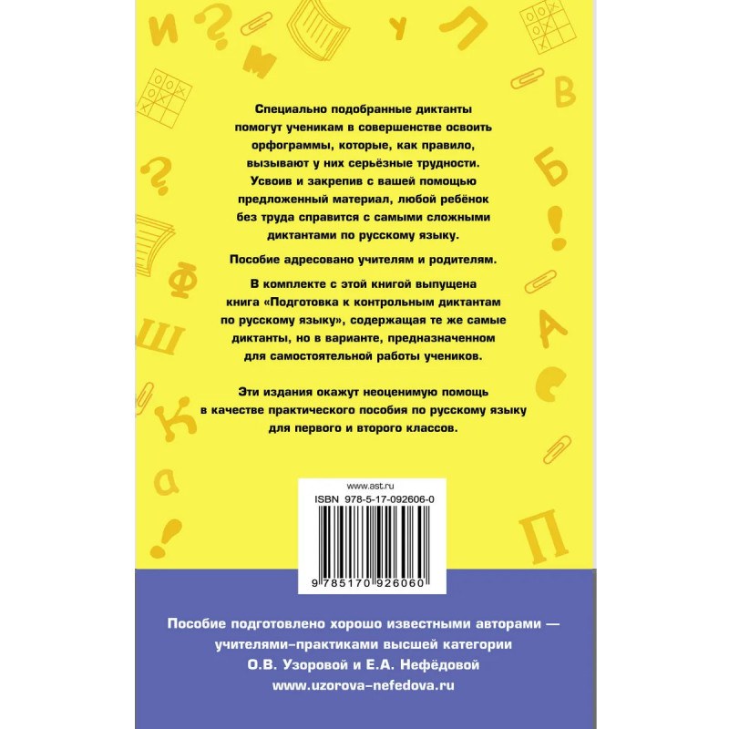 Комплект книг ("Контрольные диктанты по русскому языку", "Подготовка к контрольным диктантам по русскому языку") станет незаменимым помощником ученикам первого и второго классов, желающим качественно отработать все орфограммы, изучаемые на уроках русского языка. К каждой орфограмме подобраны специальные диктанты, помогающие ребенку надежно закрепить знания по данной теме.