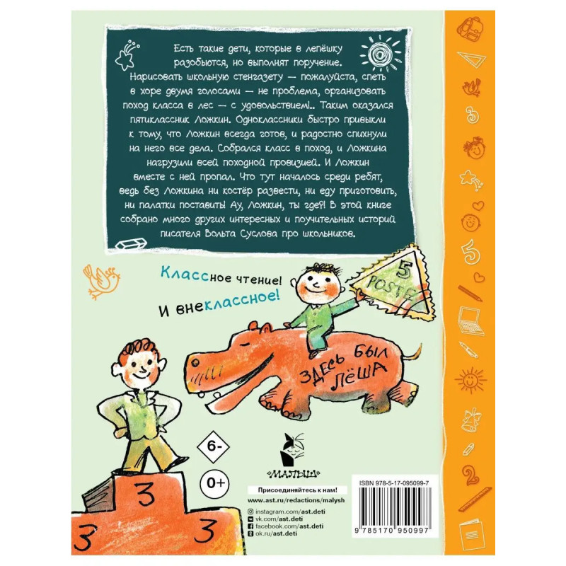 Есть такие дети, которые в лепёшку разобьются, но выполнят поручение. Нарисовать школьную стенгазету пожалуйста, спеть в хоре двумя голосами не проблема, организовать поход класса в лес с удовольствием!.. Таким оказался пятиклассник Ложкин. Одноклассники быстро привыкли к тому, что Ложкин всегда готов и радостно спихнули на него все дела. Собрался класс в поход, и Ложкина нагрузили всей походной провизией. И Ложкин вместе с ней пропал. Что тут началось среди ребят, ведь без Ложкина ни костёр развести, ни еду приготовить, ни палатки поставить! Ау, Ложкин, ты где?! В этой книге собрано много других интересных и поучительных историй писателя Вольта Суслова про школьников.