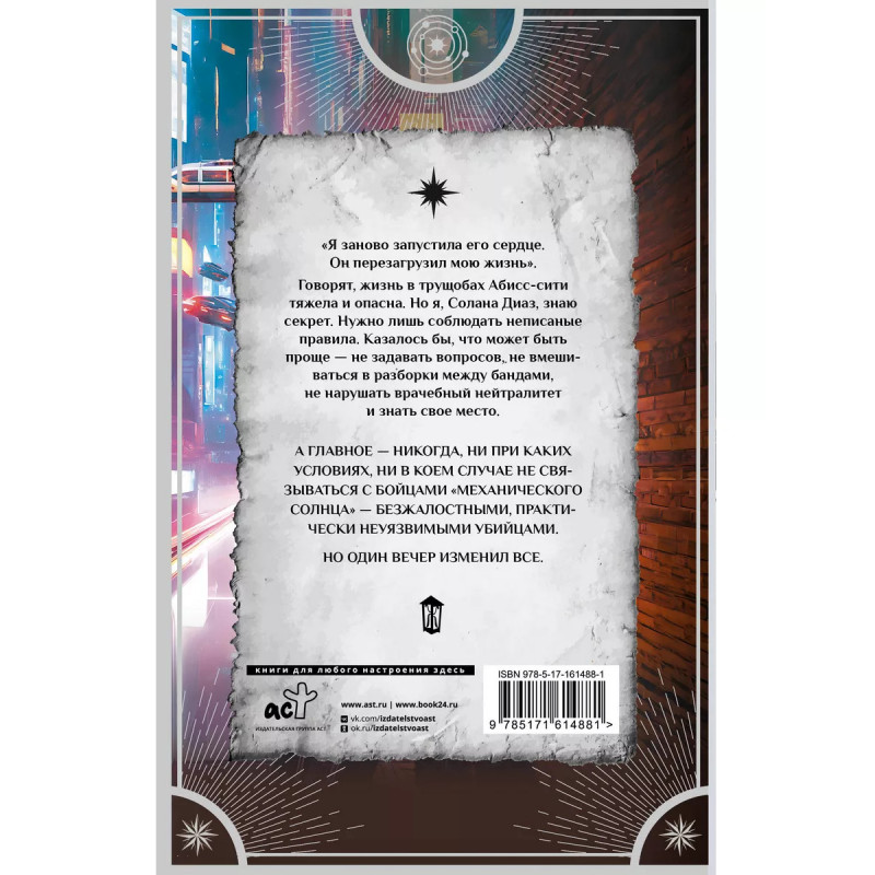 Реанимация солнца. "Я заново запустила его сердце. Он перезагрузил мою жизнь". Говорят, жизнь в трущобах Абисс-сити тяжела и опасна. Но я, Солана Диаз, знаю секрет. Нужно лишь соблюдать неписаные правила. Казалось бы, что может быть проще - не задавать вопросов, не вмешиваться в разборки между бандами, не нарушать врачебный нейтралитет и знать свое место. А главное - никогда, ни при каких условиях, ни в коем случае не связываться с бойцами "Механического солнца" - безжалостными, практически неуязвимыми убийцами. Но один вечер изменил все.