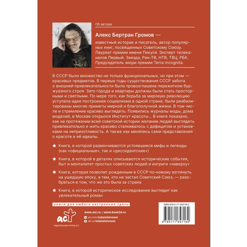 В СССР было множество не только функциональных, но при этом — красивых предметов. В первые годы существования СССР забота о внешней привлекательности была провозглашена пережитком буржуазного строя. Зато города и квартиры должны были стать просторными и светлыми. По мере того, как борьба за мировую революцию уступала идее построения социализма в одной стране, были реабилитированы многие приметы мирной и благополучной жизни. В том числе и стремление красиво выглядеть. Появились журналы моды, дома моделей, в Москве открылся Институт красоты… В книге показано, как на протяжении всей советской истории желание людей выглядеть привлекательно и жить красиво сталкивалось с дефицитом и установками на неприхотливость.