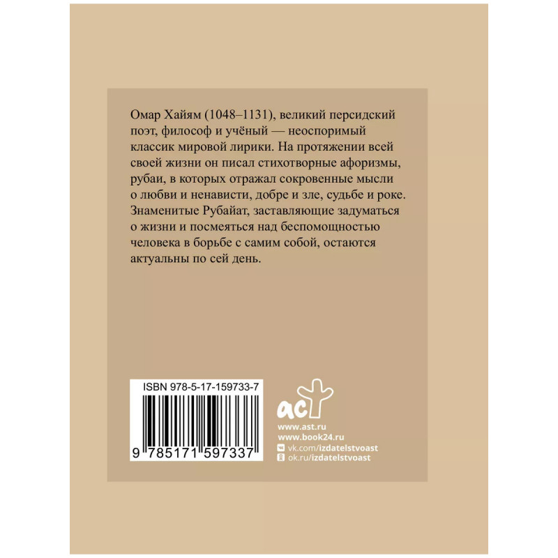 Рубаи с иллюстрациями. Омар Хайям (1048-1131) - великий персидский поэт, философ и учёный, неоспоримый классик мировой лирики. На протяжении всей своей жизни он писал стихотворные афоризмы, рубаи, в которых отражал сокровенные мысли о любви и ненависти, добре и зле, судьбе и роке. Знаменитые рубайат, заставляющие задуматься о жизни и посмеяться над беспомощностью человека в борьбе с самим собой, остаются актуальны по сей день.