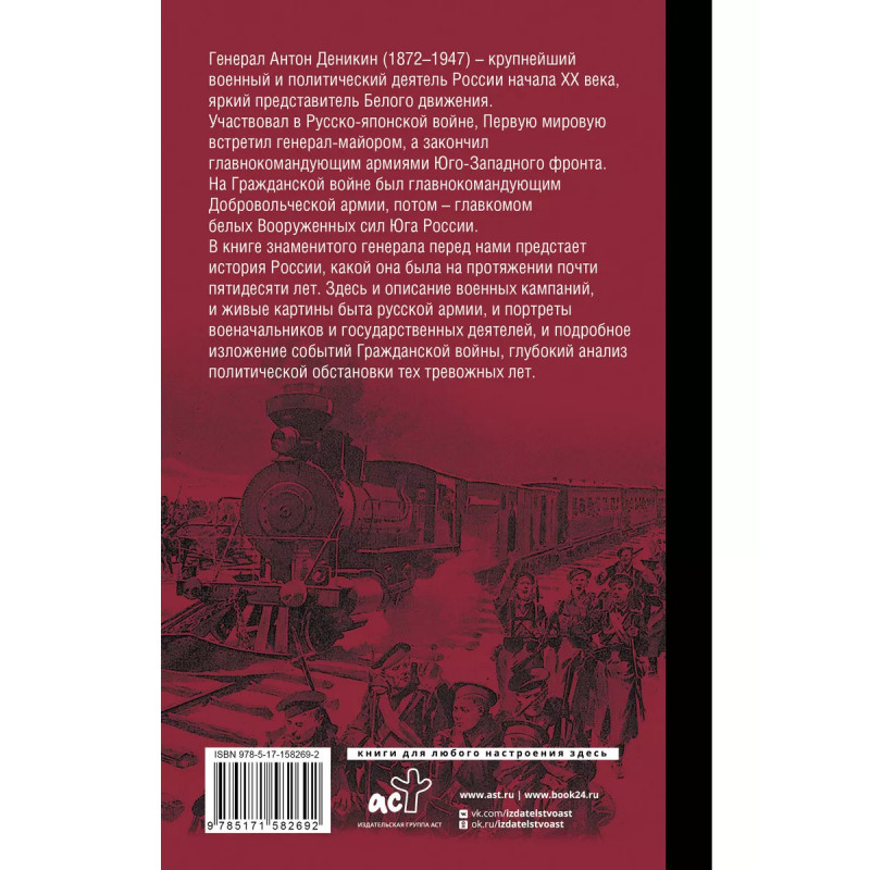 Очерки русской смуты. Генерал Антон Деникин (1872-1947) - крупнейший военный и политический деятель России начала XX века, яркий представитель Белого движения. Участвовал в Русско-японской войне, Первую мировую встретил генерал-майором, а закончил главнокомандующим армиями Юго-Западного фронта. На Гражданской войне был главнокомандующим Добровольческой армии, потом - главкомом белых Вооруженных сил Юга России. В книге знаменитого генерала перед нами предстает история России, какой она была на протяжении почти пятидесяти лет. Здесь и описание военных кампаний, и живые картины быта русской армии, и портреты военачальников и государственных деятелей, и подробное изложение событий Гражданской войны, глубокий анализ политической обстановки тех тревожных лет.