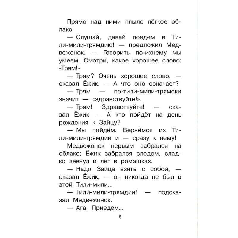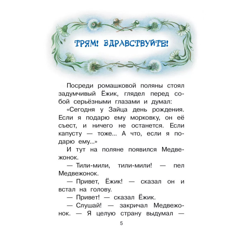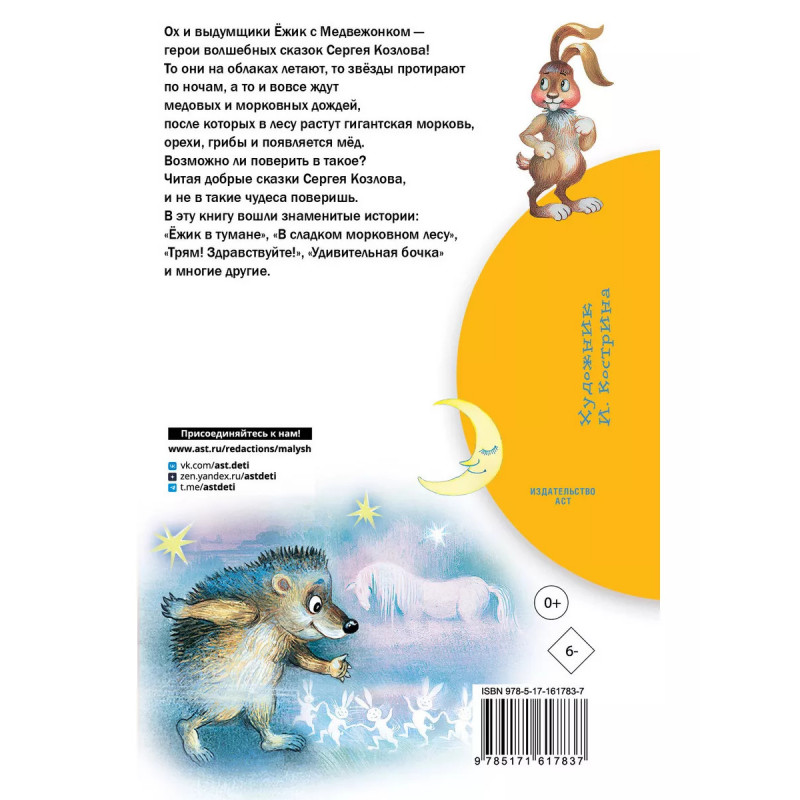 Сказки о Ёжике и Медвежонке. Ох и выдумщики Ёжик с Медвежонком - герои волшебных сказок Сергея Козлова! То они на облаках летают, то звёзды протирают по ночам, а то и вовсе ждут медовых и морковных дождей, после которых в лесу растут гигантская морковь, орехи, грибы и появляется мёд. Возможно ли поверить в такое? Читая добрые сказки Сергея Козлова, и не в такие чудеса поверишь. В эту книгу вошли знаменитые истории: "Ёжик в тумане", "В сладком морковном лесу", "Трям! Здравствуйте!", "Удивительная бочка" и многие другие.