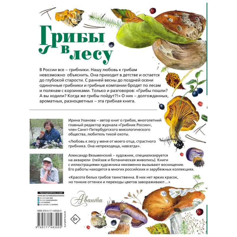 Грибы в лесу. Полезная красота - так двумя словами можно охарактеризовать эту уникальную книгу. Невероятно изысканные, запоминающиеся иллюстрации мастера акварели Александра Вязьменского, который много лет рисует грибы с натуры, дополняют рассказы многолетнего редактора журнала "Грибник России", члена Санкт-Петербургского микологического общества Ирины Ухановой. Интересная и полезная информация в сочетании с яркими, сочными иллюстрациями порадует как любителей тихой охоты, так и ценителей искусства. Кроме того, в книгу вставлен мастер-класс по рисованию. Для всех, кто любит собирать грибы, а также для тех, кто учится рисовать и стремится повысить свой уровень.