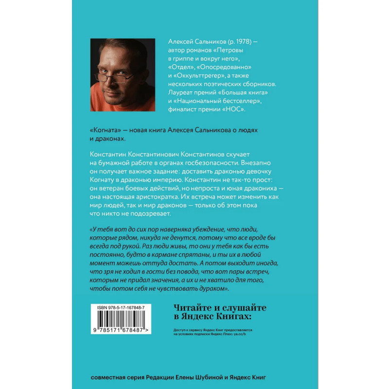 Алексей Сальников (р. 1978) — автор романов "Петровы в гриппе и вокруг него", "Отдел", "Опосредованно" и "Оккульттрегер", а также нескольких поэтических сборников. Лауреат премий "Большая книга" и "Национальный бестселлер", финалист премии "НОС". "Когната" — новая книга Алексея Сальникова о людях и драконах. Константин Константинович Константинов скучает на бумажной работе в органах госбезопасности. Внезапно он получает важное задание: доставить драконью девочку Когнату в драконью империю. Константин не так-то прост: он ветеран боевых действий, но непроста и юная дракониха — она настоящая аристократка. Их встреча может изменить как мир людей, так и мир драконов — только об этом пока что никто не подозревает.