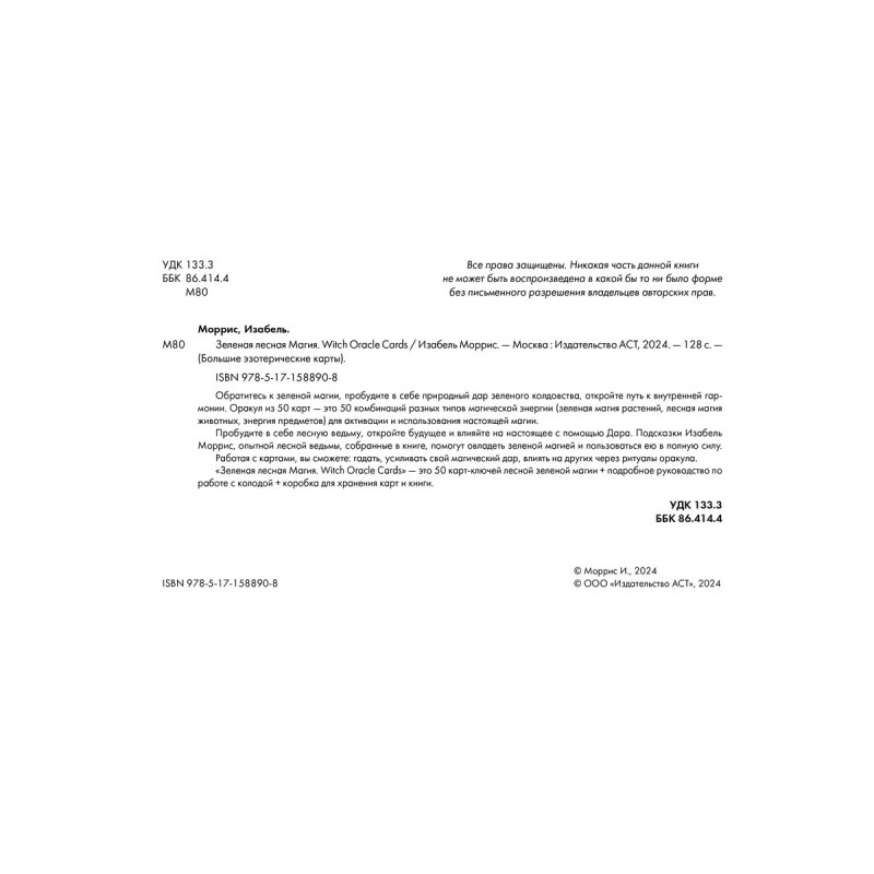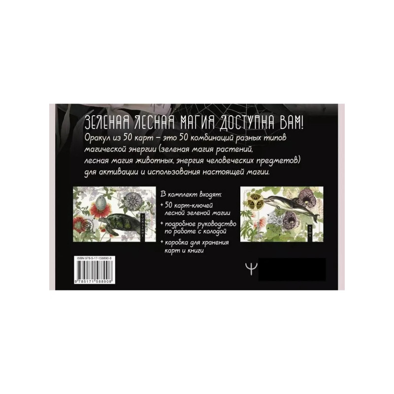 Оракул из 50 карт это 50 комбинаций разных типов магической энергии (зеленая магия растений, лесная магия животных, энергия предметов) для активации и использования настоящей магии. Используя эти энергии, вы сможете: гадать и предсказывать, усиливать свой магический дар, влиять на других через ритуалы оракула. Применяйте данную вам силу с умом, и Мать-Природа одарит вас. Работа с оракулом может проходить как по советам автора опытной ведьмы Изабель Моррис, так и по вашему индивидуальному пути (наитие, вдохновение или четкий план). В эзотерический набор входят: 50 карт оракула; книга-инструкция; коробка для хранения карт и книги.