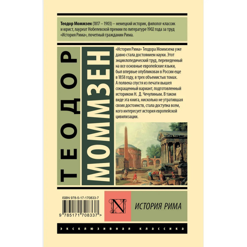 — Фундаментальный труд по истории Древнего Рима, принесший Теодору Моммзену мировую известность и Нобелевскую премию по литературе. — «История Рима» охватывает период от основания Рима и до падения Республики в битве при Тапсе в 46 году до н.э., когда легионы Цезаря разгромили силы республиканцев. — В данное издание вошла сокращенная и адаптированная версия (компендиум) «Истории Рима», подготовленная русским историком Николаем Дмитриевичем Чечулиным по заказу князя Горчакова в 1909 году. — Для всех, кто часто думает о Римской империи. — Издание в серии «Эксклюзивная классика» (Лучшее») — в узнаваемом оформлении и твердой обложке.