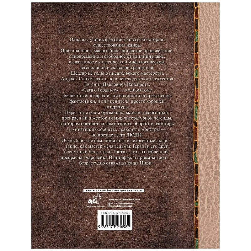 Одна из лучших фэнтези-саг за всю историю существования жанра. Оригинальное, масштабное эпическое произведение, одновременно и свободное от влияния извне, и связанное с классической мифологической, легендарной и сказовой традицией. Шедевр не только писательского мастерства Анджея Сапковского, но и переводческого искусства Евгения Павловича Вайсброта. "Сага о Геральте" в одном томе. Бесценный подарок и для поклонника прекрасной фантастики, и для ценителя просто хорошей литературы. Перед читателем буквально оживает необычный, прекрасный и жестокий мир литературной легенды, в котором обитают эльфы и гномы, оборотни, вампиры и "низушки"-хоббиты, драконы и монстры, но прежде всего ЛЮДИ. Очень близкие нам, понятные и человечные люди такие как мастер меча ведьмак Геральт, его друг, беспутный менестрель Лютик, его возлюбленная, прекрасная чародейка Йеннифэр, и приемная дочь безрассудно отважная юная Цири