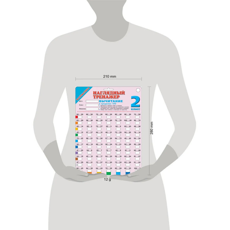 Наглядный тренажер окажется незаменимым помощником при изучении вычитания в пределах 100. Пользоваться им очень просто: 1. Вычисли и запиши ответ в окошке. 2. Переверни карточку другой стороной и наложи на записи так, чтобы они появились в окошках. 3. Сверь свои ответы с ответами на карточке.