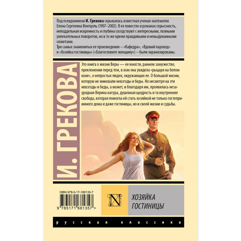 — Классика русской литературы. — От автора романов «Пороги», «Кафедра» и «Вдовий пароход». — В произведениях Ирины Грековой серьезность, неподдельная искренность и глубина соседствуют с интересными, полными увлекательных поворотов и в то же время правдивыми сюжетами. — В 2003 году повесть «Хозяйка гостиницы» легла в основу знаменитого фильма Станислава Говорухина «Благословите женщину» со Светланой Ходченковой в главной роли. — Издание в серии «Эксклюзив: Русская классика» — в удобном карманном формате и узнаваемом оформлении.