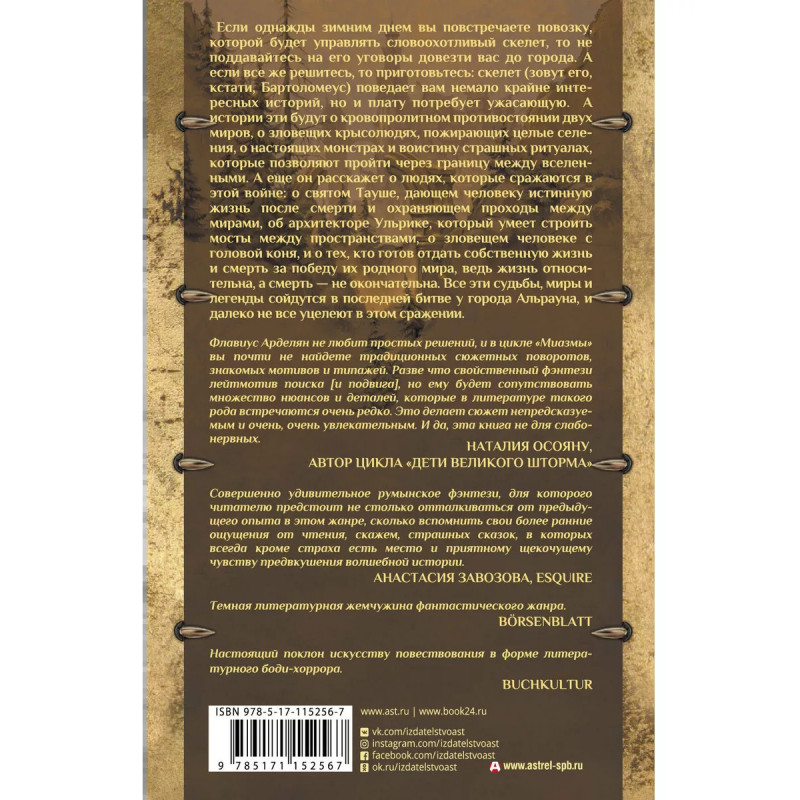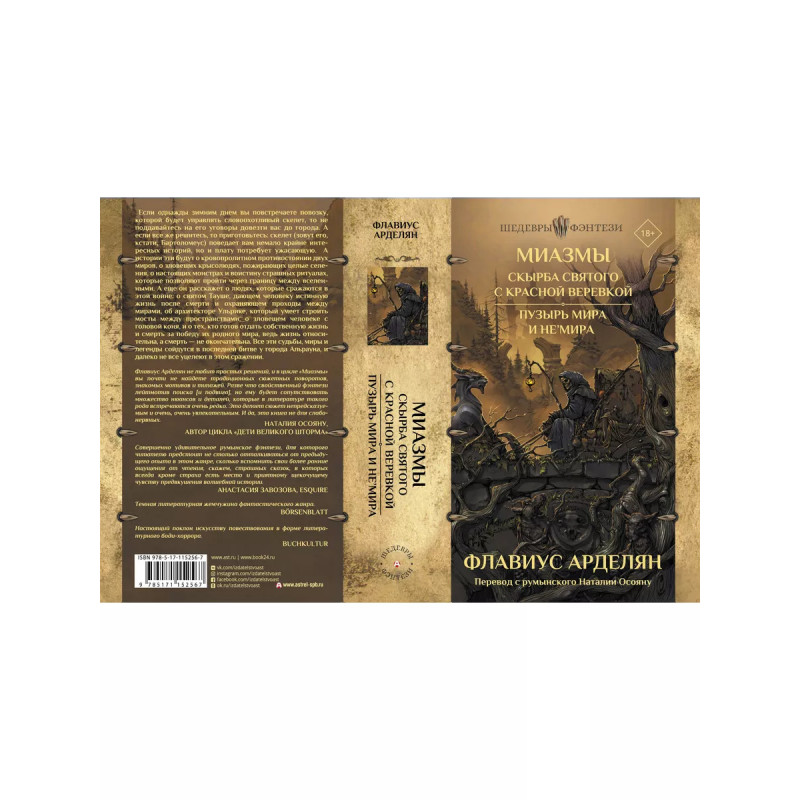 Миазмы: Скырба святого с красной веревкой. Пузырь Мира и НеМира. Флавиус Арделян - один из самых ярких и самобытных представителей румынской фэнтези. В книгу "Миазмы" вошли два романа из одноимённого цикла: "Скырба святого с красной веревкой" и "Пузырь Мира и Не'Мира". Поэтическое, невероятно страшное и крайне причудливое воображение Флавиуса Арделяна не имеет аналогов, но придётся по душе всем поклонникам Клайва Баркера и Чайны Мьевиля. Писатель создает свой собственный, изысканный и жуткий мир, в котором затейливо переплетаются друг с другом мотивы тёмного фэнтези, "новых странных", магического реализма и боди-хоррора. Перед нами - один из самых запоминающихся романов жанра за долгие годы. А вот чего вы точно не найдете в книгах Мьевиля - так это клишированных сюжетных поворотов, знакомых мотивов и типажей.