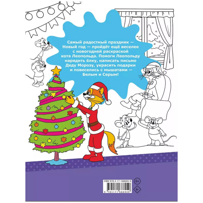 Самый радостный праздник Новый год пройдёт ещё веселее с новогодней раскраской кота Леопольда. Помоги Леопольду нарядить ёлку, написать письмо Деду Морозу, украсить подарки и повеселись с мышатами Белым и Серым! Используй яркие цвета, фантазию и не забудь про хорошее настроение!