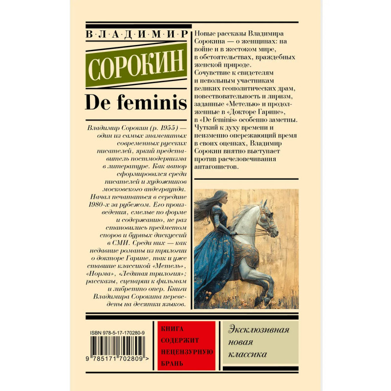 Сорокин остаётся собой — выстраивает карнавальные антиутопии, жонглирует цитатами из канонической русской литературы и овеществляет метафоры — и в то же время продолжает двигаться в новом направлении. Всё большее сочувствие к свидетелям и невольным участникам великих геополитических драм, повествовательность и лиризм, заданные “Метелью” и продолженные в “Докторе Гарине”, в “De feminis” особенно заметны.