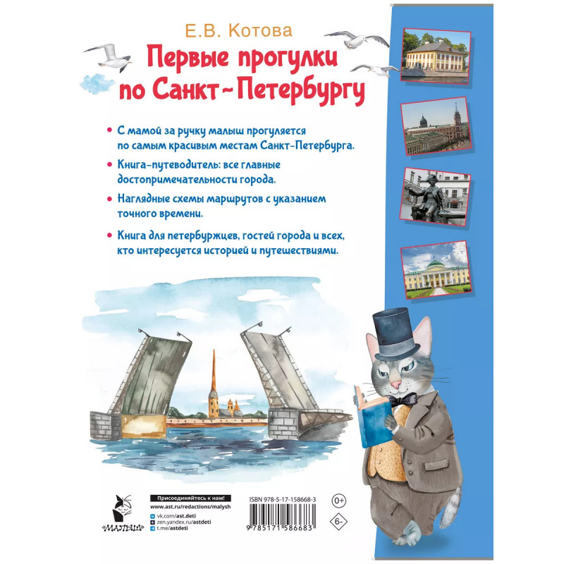 Живёте в Санкт-Петербурге? Или планируете путешествие всей семьёй? Или интересуетесь историей? Или хотите рассказать ребёнку что-то новое? В любом случае книга-путеводитель Первые прогулки по Санкт-Петербургу для вас! Северная Венеция. Новый Амстердам. Город на островах. Разводные мосты. Белые ночи. Величественный и загадочный, строгий и скромный, яркий и современный всё это о замечательном городе Санкт-Петербург! Забавный петербургский кот проведёт экскурсию по городу, покажет главные достопримечательности и расскажет о разных архитектурных стилях. Красиво иллюстрированная книга написана простым, понятным языком и станет отличным подарком ребёнку, живущему в любом городе мира.