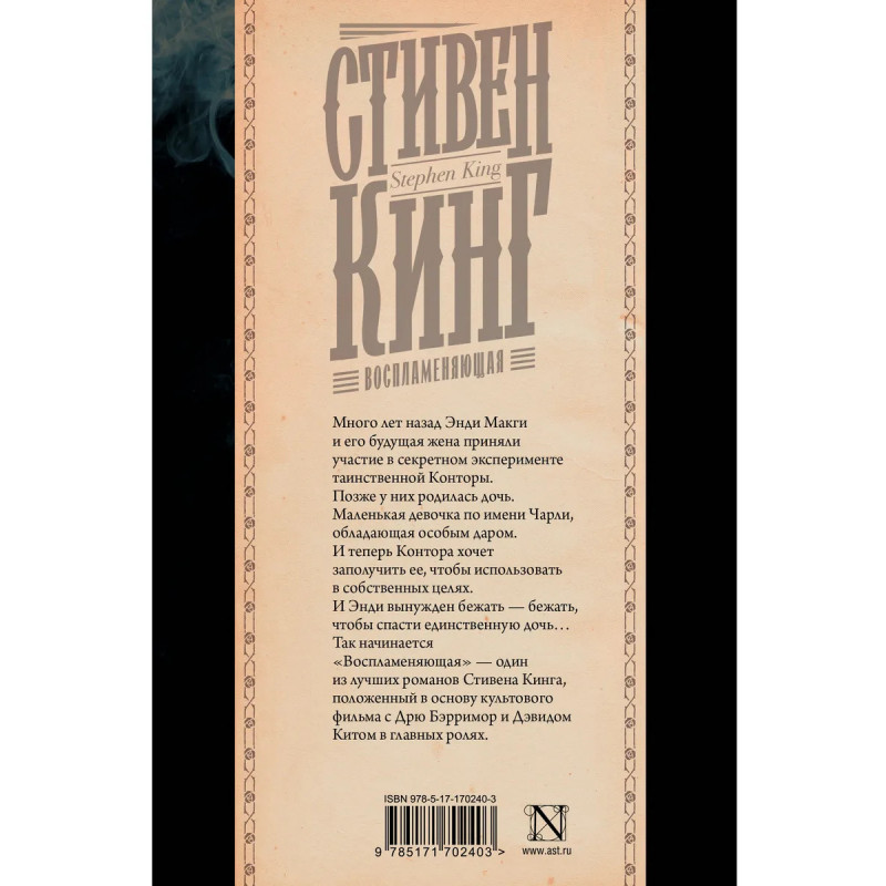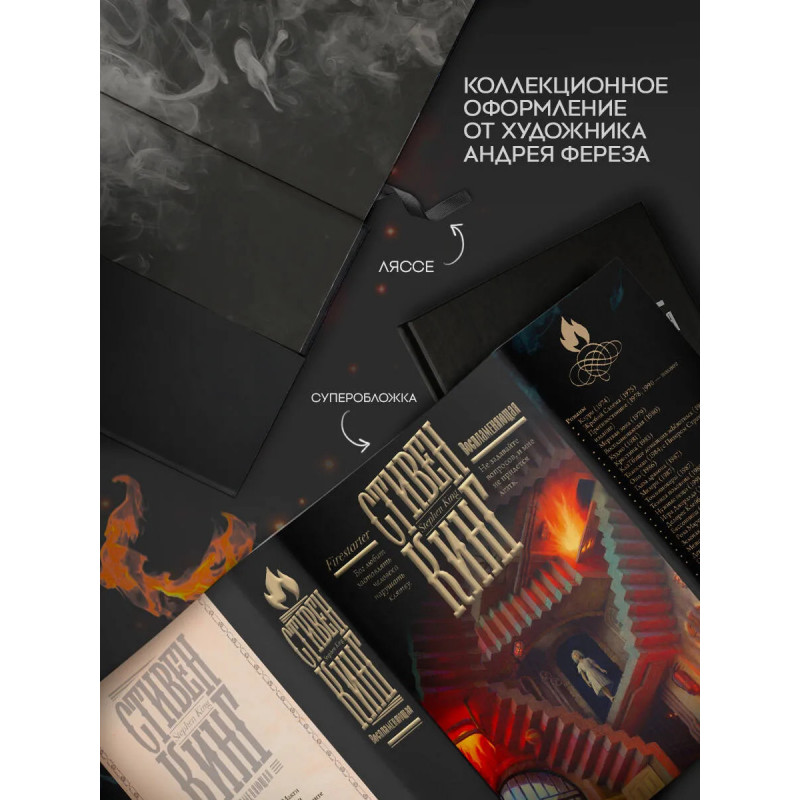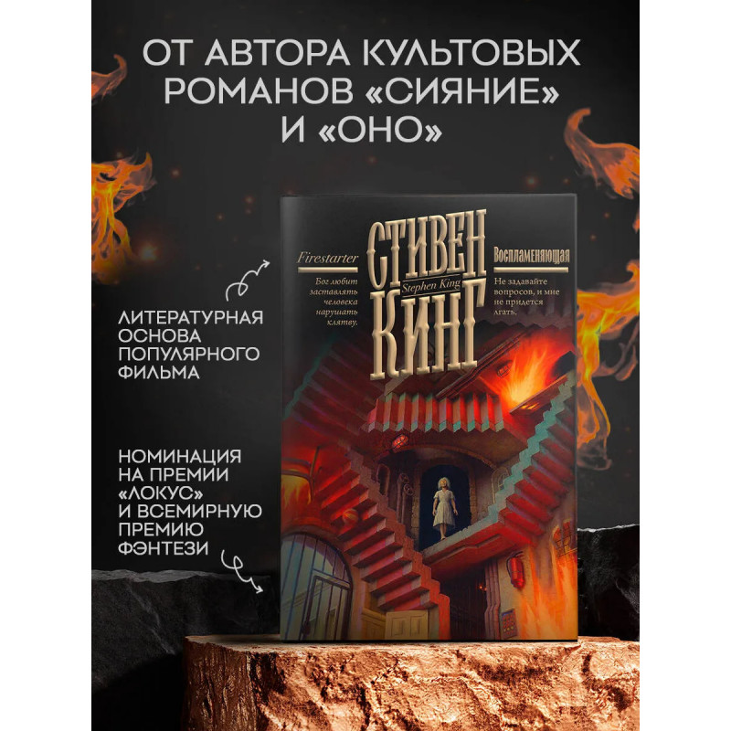 Стивен Кинг — один из самых популярных писателей современности. За свою долгую и насыщенную карьеру он написал порядка 70 бестселлеров, которые переведены на 44 языка, изданы в 80 странах и разошлись по свету тиражом свыше 400 000 000 экземпляров. На счету Кинга такие бестселлеры как «Зеленая миля», «Оно», «Кладбище домашних животных», «Кэрри», «Сияние» и «Билли Саммерс». «Воспламеняющая» считается одним из лучших произведений Кинга. Роман номинировался на премии «Локус» и Всемирную премию фэнтези и дважды экранизировался — в 1984 и 2022 годах. Переиздание в коллекционном оформлении Андрея Фереза.