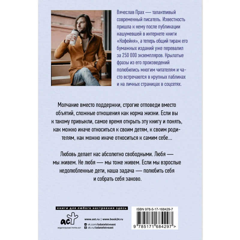 - Сентиментальная проза. - Одна из самых цитируемых книг Вячеслава Праха после знаменитой Кофейни. - Послание автора дочери, сыну и своим читателям. - Книга о том, что наш путь по жизни закладывается еще в детстве и о том, как важно помнить об этом, воспитывая собственных детей. - Темы, которые принято обходить вниманием в российской семье: личная значимость, границы в отношениях, ответственность не только детей, но и родителей. - Серия Кофейня. Бестселлеры Вячеслава Праха: лучшие книги автора в едином оформлении и удобном карманном формате.