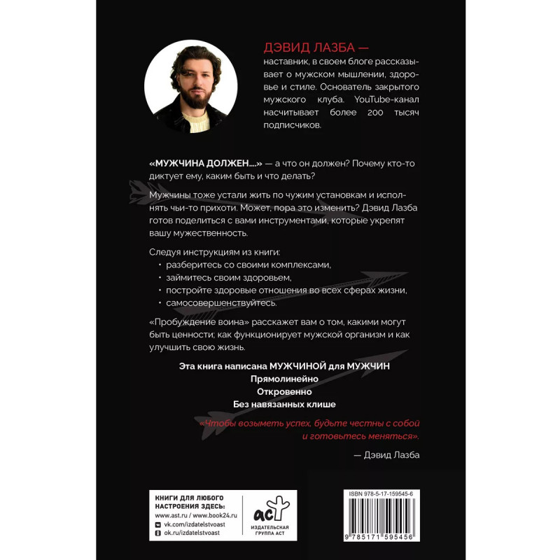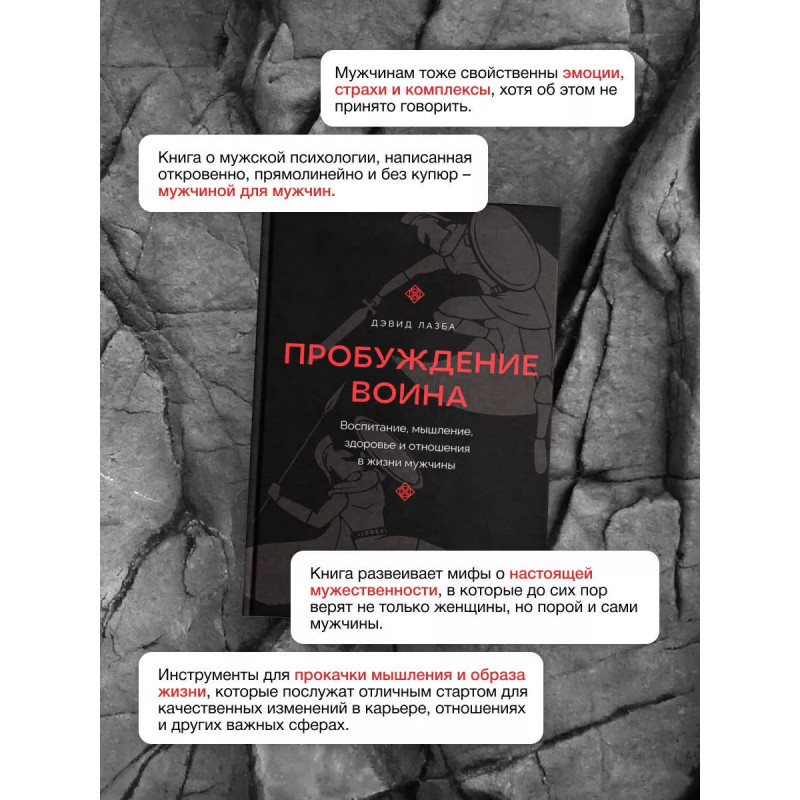 "МУЖЧИНА ДОЛЖЕН" а что он должен? Почему кто-то диктует ему, каким быть и что делать? Мужчины тоже устали жить по чужим установкам и исполнять чьи-то прихоти. Может, пора это изменить? Дэвид Лазба готов поделиться с вами инструментами, которые укрепят вашу мужественность. Следуя инструкциям из книги: Разберитесь со своими комплексами, Займитесь своим здоровьем, Постройте здоровые отношения во всех сферах жизни, Самосовершенствуйтесь. "Пробуждение воина" расскажет вам о том, какими могут быть ценности; как функционирует мужской организм и как улучшить свою жизнь. Эта книга написана МУЖЧИНОЙ для МУЖЧИН Прямолинейно Откровенно Без навязанных клише