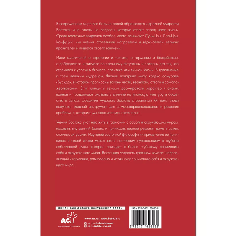 В современном мире все больше людей обращаются к древней мудрости Востока, ища ответы на вопросы, которые ставит перед нами жизнь. Среди восточных мудрецов особое место занимают Сунь-Цзы, Лао-Цзы, Конфуций, чьи учения столетиями направляли и вдохновляли великих правителей и лидеров своего времени. Идеи мыслителей о стратегии и тактике, о гармонии и бездействии, о добродетели и ритуале по-прежнему актуальны и полезны для тех, кто стремится к успеху в бизнесе, политике или личной жизни. В дополнение к трем великим мудрецам. Япония подарила миру кодекс самураев "Бусидо", в котором прописаны законы чести, верности, отваги и самопожертвования. Эти принципы веками формировали характер японских воинов и продолжают оказывать влияние на японскую культуру и общество в целом. Соединив мудрость Востока с реалиями XXI века, люди получают мощный инструмент для самосовершенствования и решения проблем, с которыми мы сталкиваемся ежедневно.