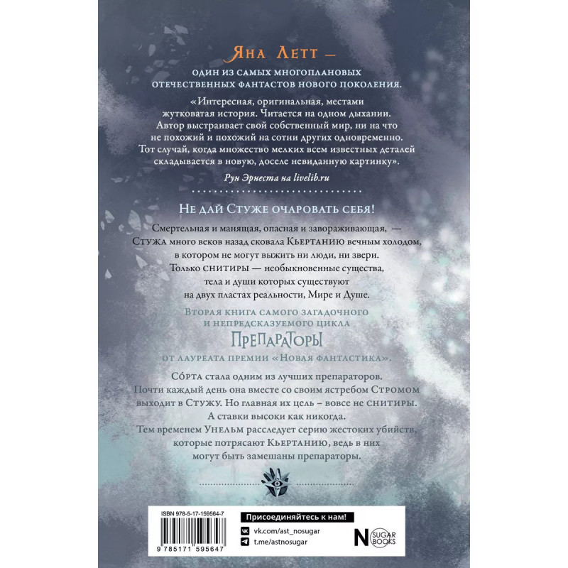 Препараторы. Сердце Стужи. Новый фэнтези-цикл в лучших традициях Ли Бардуго и Джорджа Мартина! Смертельная и манящая, опасная и завораживающая - Стужа много веков назад сковала Кьертанию вечным холодом, в котором не могут выжить ни люди, ни звери. Только магические снитиры - необыкновенные существа, тела и души которых существуют на двух пластах реальности. Их части тел поддерживают жизнь и тепло в человеческих городах. Их сердца - бьются вместо моторов. Их глаза - разрезают темноту вместо фонарей. Охотиться на снитиров способны только препараторы - люди, обладающие особыми физическими свойствами. Для любого из них служба - дело всей жизни. Но чего им стоит этот дар на самом деле? Книга "Сердце Стужи" - продолжает погружать на в мир, полный тайн, политических интриг, страха и любви. Это превосходный пример качественной отечественной young adult-литературы: завораживающий авторский слог, повествование с разных точек зрения, психологическая точность и вечные темы. Борьба с системой; долг и любовь; тайна возникновения смертельно опасной С