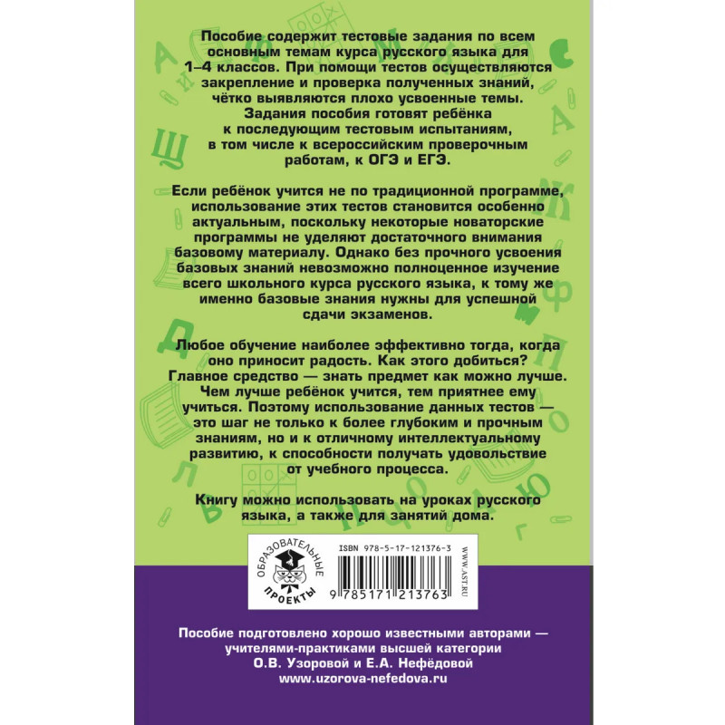 Тесты современный, удобный, быстрый и качественный вид проверки и контроля знаний учащихся. Они предоставляют возможность проявить самостоятельность, индивидуальность, способствуют обучению школьников самоконтролю. Пособие содержит тестовые задания по всем основным темам курса русского языка для начальной школы. Для удобства проверки и самопроверки на все тесты в конце книги даны ответы. Пособие можно использовать как на уроках русского языка для проверки знаний учащихся, так и для самостоятельных занятий дома.