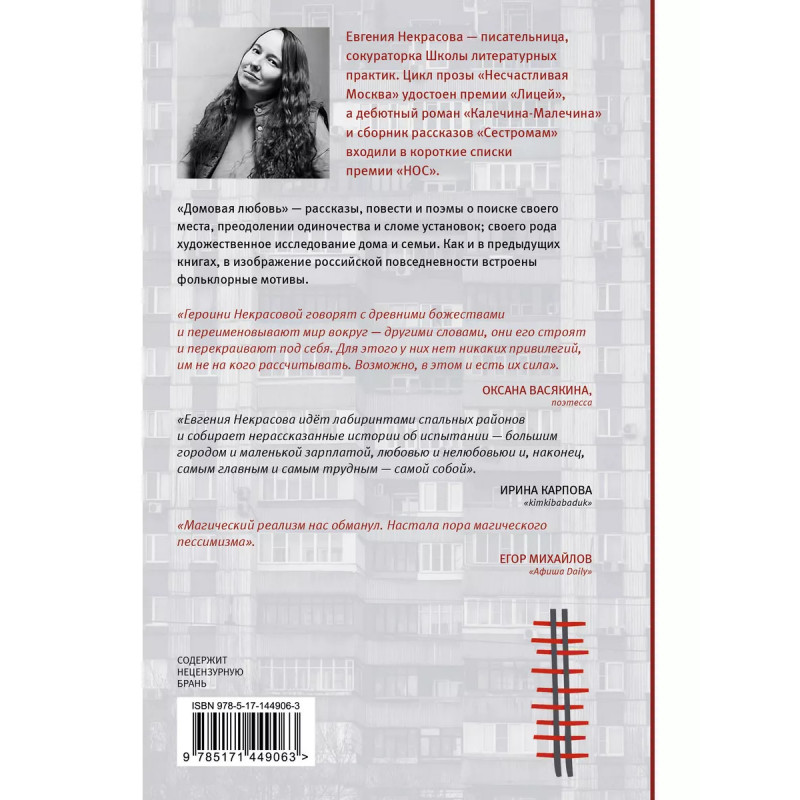 Домовая любовь. Евгения Некрасова - писательница, сокураторка Школы литературных практик. Её цикл прозы "Несчастливая Москва" удостоен премии "Лицей", а дебютный роман "Калечина-Малечина" и сборник рассказов "Сестромам" входили в короткие списки премии "НОС". Новый сборник "Домовая любовь" - рассказы, повести и поэмы о преодолении одиночества и сломе установок; своего рода художественное исследование дома и семьи. Как и в предыдущих книгах, в изображение российской повседневности встроены фольклорные мотивы. "Меня удивляют тексты Евгении Некрасовой. Когда я их читаю, я забываю, что передо мной текст - они сделаны так, что мне все время кажется, что я смотрю кино. На меня выскакивают куклы-строители - таких я могла встретить в хорорах про детей из американского пригорода. Дальше я читаю повесть, построенную по принципу артхаусного кино, отсылающего к пленкам начала ХХ века. От этих текстов, как и от кино с хорошим сценарием, сложно оторваться. Причем неважно, насколько происходящее в них похоже на реальность. Одна героиня дви