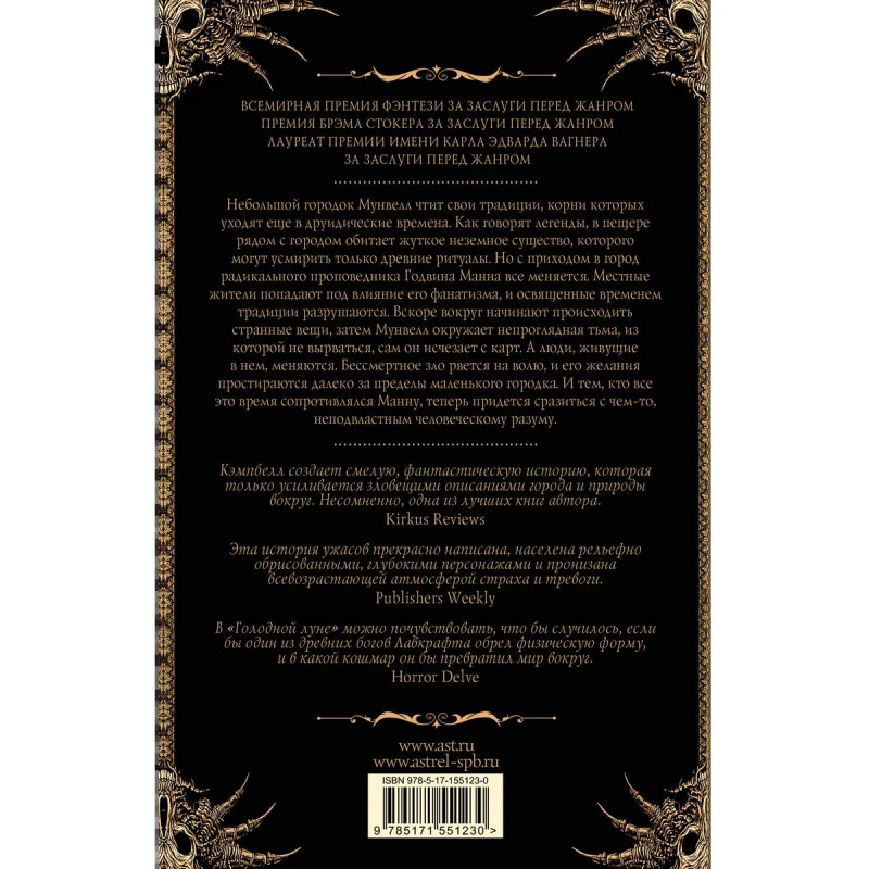 — Новая книга серии «Легенды хоррора». — Впервые на русском языке! Одна из самых известных книг автора романов «Ночное дежурство» и «Полуночное солнце». — Гранд-мастер хоррора Рэмси Кэмпбелл — один из признанных мастеров жанра, за свою долгую и насыщенную карьеру он удостоился множества самых главных жанровых наград, в том числе Всемирной премии фэнтези, Британской премии фэнтези и премии Брэма Стокера. — «Голодная луна» — лауреат Британской премии фэнтези. — Для всех поклонников творчества Стивена Кинга, Адама Невилла и Клайва Баркера.