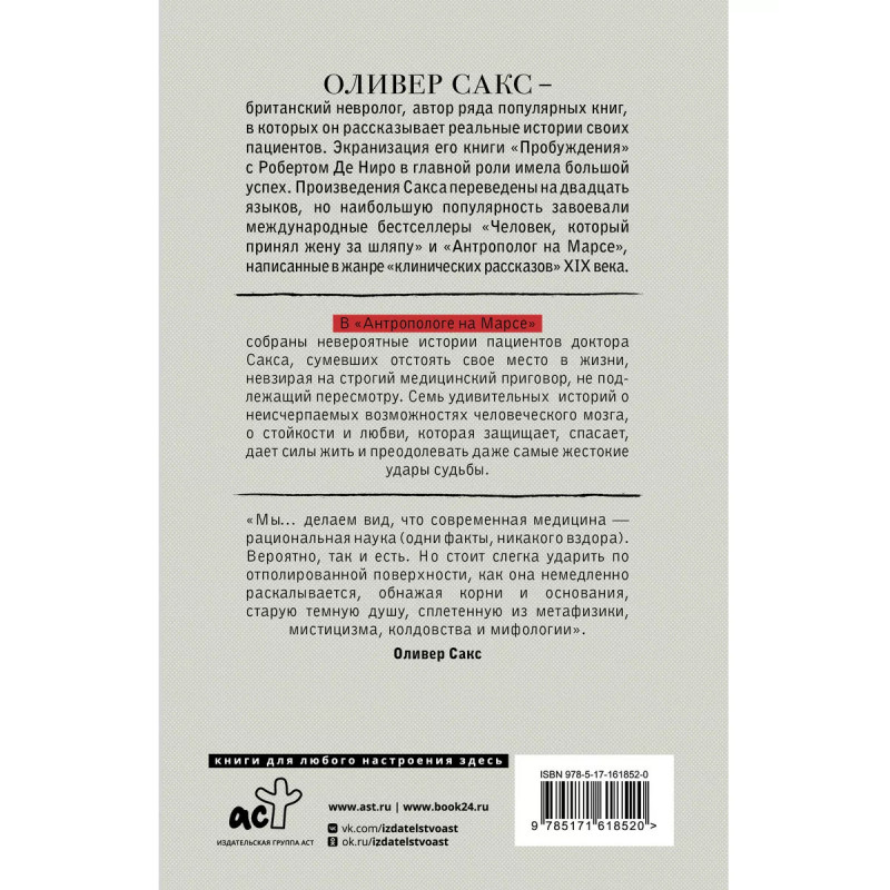 Оливер Сакс - британский невролог и нейропсихолог, автор ряда популярных книг, в которых он рассказывает реальные истории своих пациентов. Экранизация его книги "Пробуждения" с Робертом Де Ниро в главной роли имела большой успех. Произведения Сакса переведены на двадцать языков, но наибольшую популярность завоевали международные бестселлеры "Человек, который принял жену за шляпу" и "Антрополог на Марсе", написанные в жанре "клинических рассказов" ХIХ века. В "Антропологе на Марсе" собраны невероятные истории пациентов доктора Сакса, сумевших отстоять свое место в жизни, невзирая на строгий медицинский приговор, не подлежащий пересмотру. Семь удивительных историй о неисчерпаемых возможностях человеческого мозга, о стойкости и любви, которая защищает, спасает, дает силы жить и преодолевать даже самые жестокие удары судьбы.