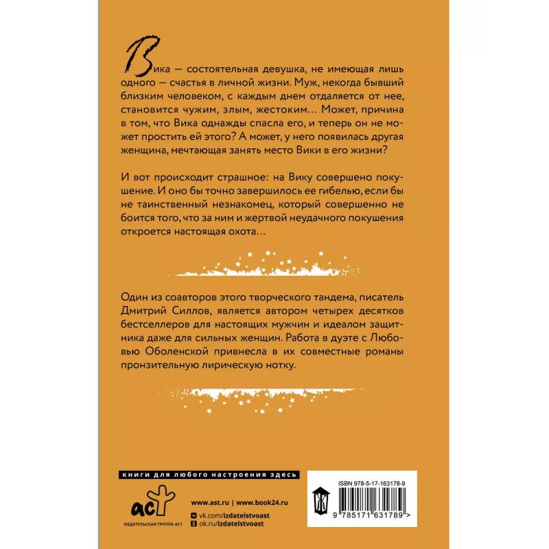 Дебютная работа Любови Оболенской в соавторстве с мастодонтом боевой фантастики Дмитрием Силловым. Читатель, привыкший к Сталкеру и Снайперу, откроет любимого автора с новой, более чувственной стороны. Когда твоя жизнь оказывается в опасности, даже от незнакомца будешь искать спасения. Страшно оставаться одной и отпускать того, что однажды тебя спас. Задача - выжить и выяснить, кто же заказчик.