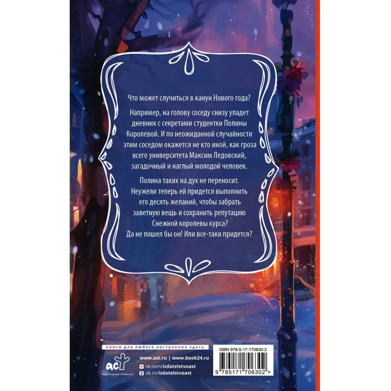 Что может случиться в канун Нового года? Например, на голову соседу снизу упадет дневник с секретами студентки Полины Королевой. И по неожиданной случайности этим соседом окажется не кто иной, как гроза всего университета Максим Ледовский, загадочный и наглый молодой человек. Полина таких на дух не переносит. Неужели теперь ей придется выполнить его десять желаний, чтобы забрать заветную вещь и сохранить репутацию Снежной королевы курса? Да не пошел бы он! Или все-таки придется? БОЛЕЕ 300 ТЫС. ПРОЧТЕНИЙ И МНОГО РАЗМЫШЛЕНИЙ О ЛЮБВИ!