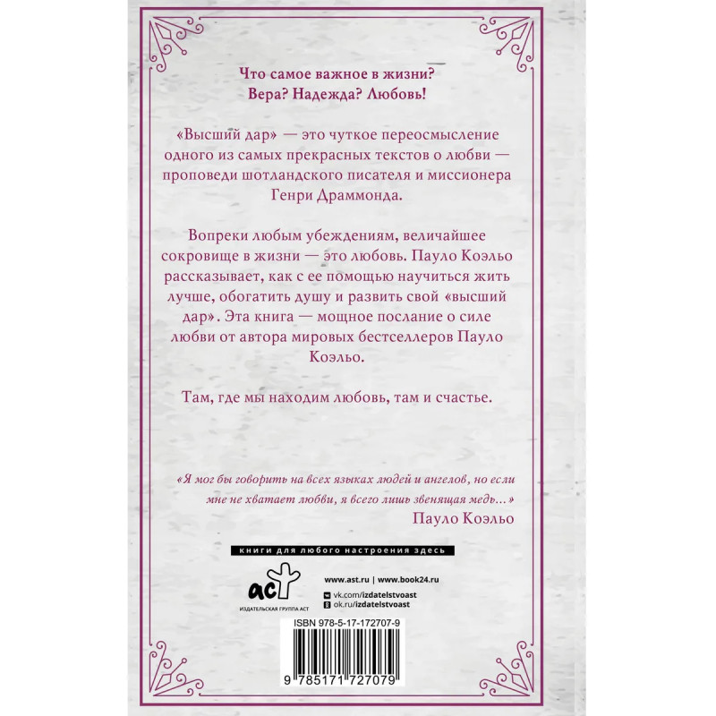 - Книга Пауло Коэльо, прежде не выходившая в России! - Авторское переосмысление невероятно красивого текста о любви — лекции шотландского писателя Генри Драммонда. - Вдумчивые рассуждения Коэльо о том, из чего состоит любовь и как найти и приумножить ее в своем сердце. - Пауло Коэльо — автор международных бестселлеров. Общий тираж книг писателя превысил 320 миллионов экземпляров, а роман «Алхимик» попал в Книгу рекордов Гиннесса как самый переводимый в мире. - Серия «Коэльо.Классика».