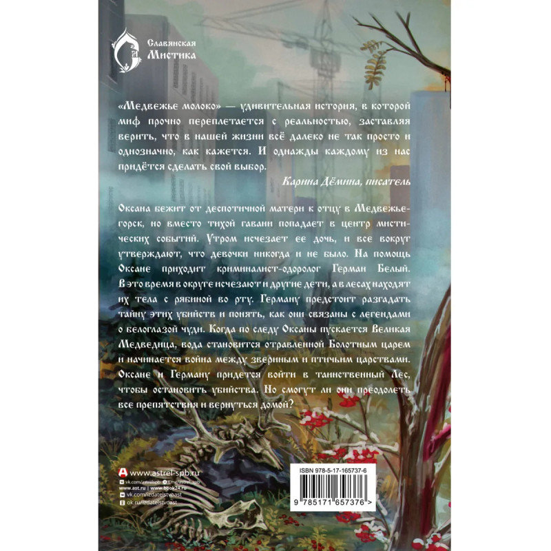 — Новая книга серии «Славянская мистика». Герои серии живут в мире, где магия и мифические существа являются частью повседневной жизни. — Для всех поклонников славянской культуры, мифологии и истории. — Страшно-прекрасная сказка с густой осенней атмосферой, элементами тру-крайма, жуткими снегирями, матерью-медведицей и очаровательным криминалистом-оборотнем в главной роли от создательницы цикла «Царство медное». — Удивительная смесь славянской мистики с фантастическим детективом и психологическим романом.