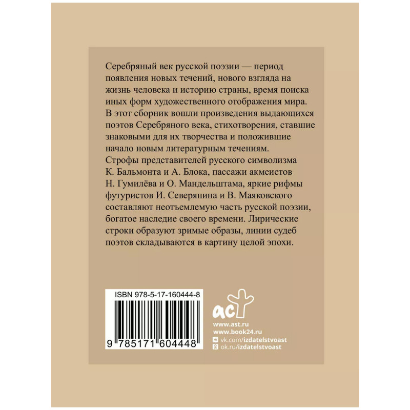 Серебряный век. Избранная лирика с иллюстрациями. Серебряный век русской поэзии - период появления новых течений, нового взгляда на жизнь человека и историю страны, время поиска иных форм художественного отображения мира. В этот сборник вошли произведения выдающихся поэтов Серебряного века, стихотворения, ставшие знаковыми для их творчества и положившие начало новым литературным течениям. Строфы представителей русского символизма К. Бальмонта и А. Блока, пассажи акмеистов Н. Гумилёва и О. Мандельштама, яркие рифмы футуристов И. Северянина и В. Маяковского составляют неотъемлемую часть русской поэзии, богатое наследие своего времени. Поэтические строки, соединяясь с биографическими очерками, образуют зримые образы, линии судеб складываются в картину целой эпохи.