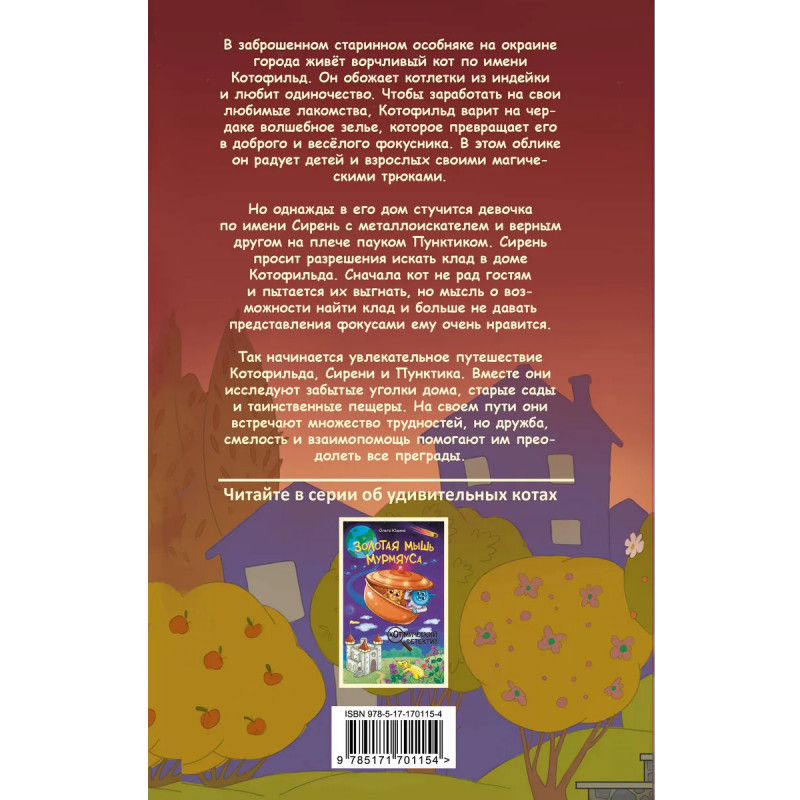 • Продолжение новой детской серии «Котмический детектив». • Сказочные приключения с элементами детектива и осенней атмосферой. • Добрая увлекательная история для детей младшего школьного возраста. • Понравится читателям цикла «Котовасия. Приключения кота по имени Тигр» Екатерины Залесской и романа «Золотая мышь Мурмяуса» Ольги Юдиной. • Милые черно-белые иллюстрации внутри.
