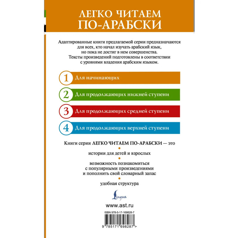 Ищете книгу на арабском языке для начинающих? Тогда обратите внимание на это пособие! Познакомьтесь с известными арабскими сказками, адаптированными для начального уровня. Каждая сказка сопровождается небольшими упражнениями на понимание прочитанного, а рядом расположены ключи. Главная особенность этой книги в том, что она читается справа налево, то есть с "последней" для нас страницы, как и любая книга на арабском языке. Такое расположение текста позволит быстрее привыкнуть к направлению арабских текстов, которые пишутся справа налево, и к чтению книг на арабском языке. Издание подойдет всем, кто приступает к изучению арабского языка.