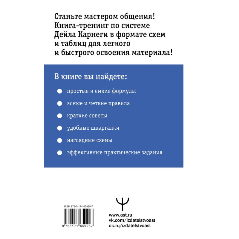 Качество нашей жизни зависит от качества общения. Без умения общаться невозможно нормально жить, стоит ли говорить об успешной карьере или личном счастье? Эта книга поможет всем, кто хочет успешно общаться с разными собеседниками, будь то рабочие или личные отношения. Дейл Карнеги один из самых известных психологов в мире. Он создал универсальные правила общения, которые помогают людям добиваться поставленных целей, становиться счастливыми, жизнерадостными, успешными, богатыми. Перед вами книга-тренинг в новом формате понятных схем и таблиц. Она подойдет всем, кто хочет овладеть мастерством коммуникации и быстро добиться качественных изменений в жизни! Простые и емкие формулы, ясные и четкие правила, краткие советы, удобные шпаргалки и, конечно же, практические задания, которые помогут вам овладеть системой Дейла Карнеги в кратчайшие сроки.