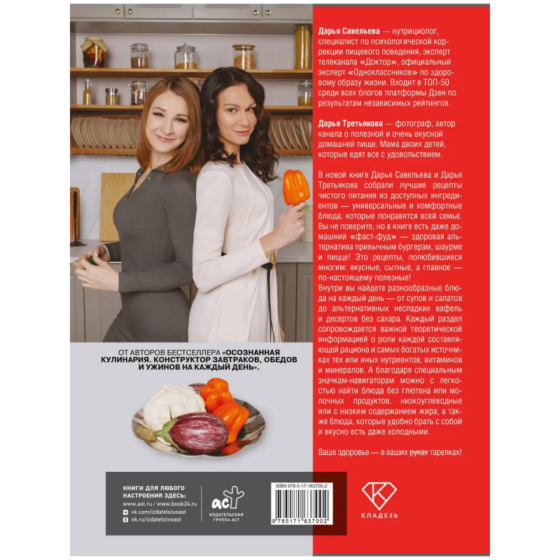 От авторов бестселлера “Осознанная кулинария. Конструктор завтраков, обедов и ужинов на каждый день”. Дарья Савельева — нутрициолог, специалист по психологической коррекции пищевого поведения, эксперт телеканала “Доктор”, официальный эксперт “Одноклассников” по здоровому образу жизни. Входит в ТОП-50 среди всех блогов платформы Дзен по результатам независимых рейтингов. Дарья Третьякова — фотограф, спортивный нутрициолог, автор канала о полезной и очень вкусной домашней пище. Мама двоих детей, которые едят все с удовольствием. В новой книге Дарья Савельева и Дарья Третьякова собрали лучшие рецепты чистого питания из доступных ингредиентов — универсальные и комфортные блюда, которые понравятся всей семье. Вы не поверите, но в книге есть даже домашний “фаст-фуд” — здоровая альтернатива привычным бургерам, шаурме и пицце! Это рецепты, полюбившиеся многим: вкусные, сытные, а главное — по-настоящему полезные!