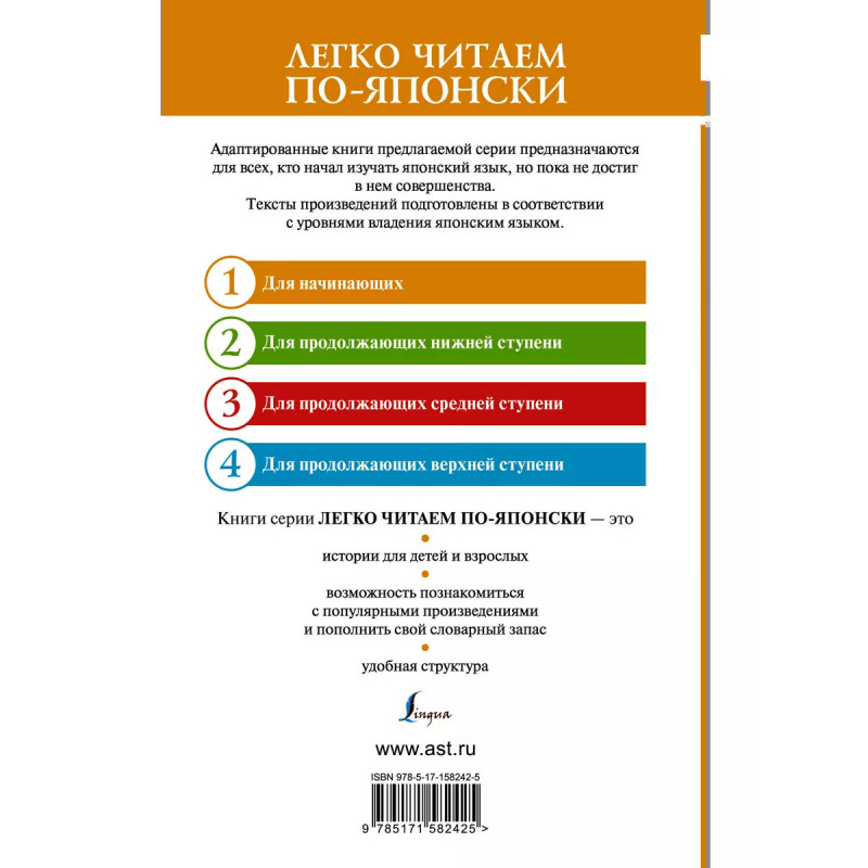 Осаму Дадзай (19091948) одна из самых трагических и вместе с тем значимых фигур японской литературы. Повесть "Исповедь "неполноценного" человека" самое известное его произведение, считающееся шедевром не только японской, но и мировой литературы. Повесть написана в жанре "ватакуси-сёсэцу" ("роман о себе") и рассказывает историю юноши по имени Ёдзо, который чувствует себя отчуждённым от окружающего мира и борется с внутренними демонами. Проникая в самые тёмные уголки человеческой души, Дадзай исследует темы одиночества, страха и поиска смысла в послевоенной Японии. Повесть была экранизирована под одноименным названием, а также получила адаптацию в виде аниме-антологии "Классические истории" и полнометражного анимационного фильма "HUMAN LOST. Исповедь неполноценного человека". Текст произведения адаптирован для начального уровня владения японским языком; в конце книги вы найдете упражнения и словарь. Книга будет полезна всем, кто изучает японский язык.
