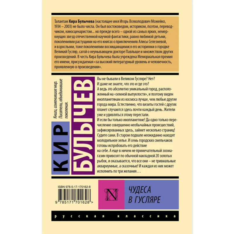 — Кир Булычев — один из классиков советской фантастики, создатель культовых «Приключений Алисы». — «Чудеса в Гусляре» — первый сборник рассказов из цикла «Великий Гусляр». — «Великий Гусляр» — самый масштабный цикл Кира Булычева, он включает в себя около сотни рассказов и семь повестей. — Рассказы из цикла более десяти раз экранизировались. — Великий Гусляр — абсолютно уникальный город, расположенный на «земной выпуклости» и потому отлично видимый инопланетянам, посещающим город с завидной регулярностью. — Издание в серии «Эксклюзив: Русская классика» — в удобном карманном формате и в узнаваемом оформлении.
