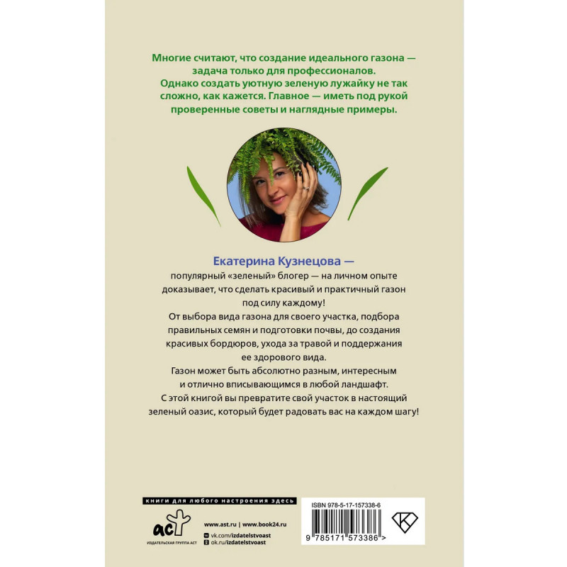 Многие считают, что создание идеального газона — задача только для профессионалов. Однако создать уютную зеленую лужайку под ногами из сочной травы не так сложно, как кажется. Екатерина Кузнецова, популярный "зеленый" блогер, на личном опыте доказывает, что сделать красивый и практичный газон под силу каждому! От выбора вида газона для своего участка, подбора правильных семян и подготовки почвы до создания красивых бордюров, ухода за газоном и поддержания его здорового вида. Газон может быть абсолютно разным, интересным и отлично вписывающимся в любой ландшафт. С этой книгой вы превратите свой участок в настоящий зеленый оазис, который будет радовать вас на каждом шагу!