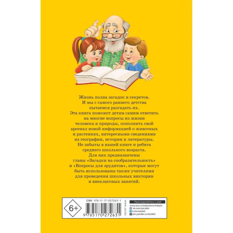 Жизнь полна загадок и секретов. И мы с раннего детства пытаемся разгадать их. Эта книга поможет детям самим ответить на многие вопросы из жизни человека и природы, пополнить свой арсенал новой информацией о животных и растениях, интересными сведениями из географии, истории и литературы. Не забыты в нашей книге и ребята среднего школьного возрас-та. Для них предназначены главы Загадки на сообразительность и Вопросы для эрудитов, которые могут быть использованы также учителями для проведе-ния школьных викторин и внеклассных занятий.