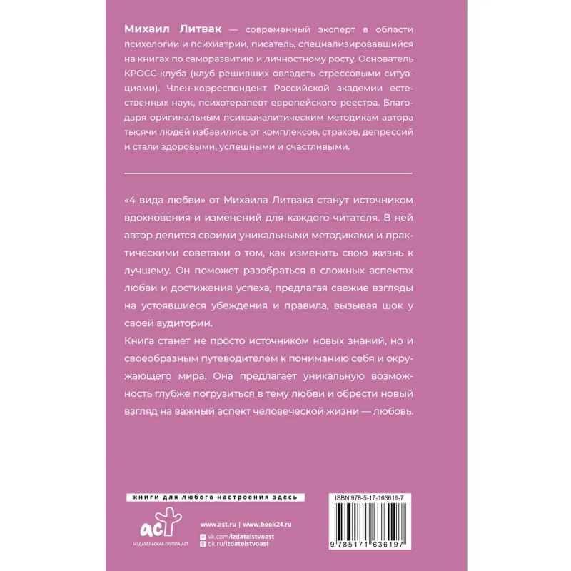 "4 вида любви" от Михаила Литвака станет источником вдохновения и изменений для каждого читателя. В ней автор делится своими уникальными методиками и практическими советами о том, как изменить свою жизнь к лучшему. Он поможет разобраться в сложных аспектах любви и достижения успеха, предлагая свежие взгляды на устоявшиеся убеждения и правила, вызывая шок у своей аудитории.